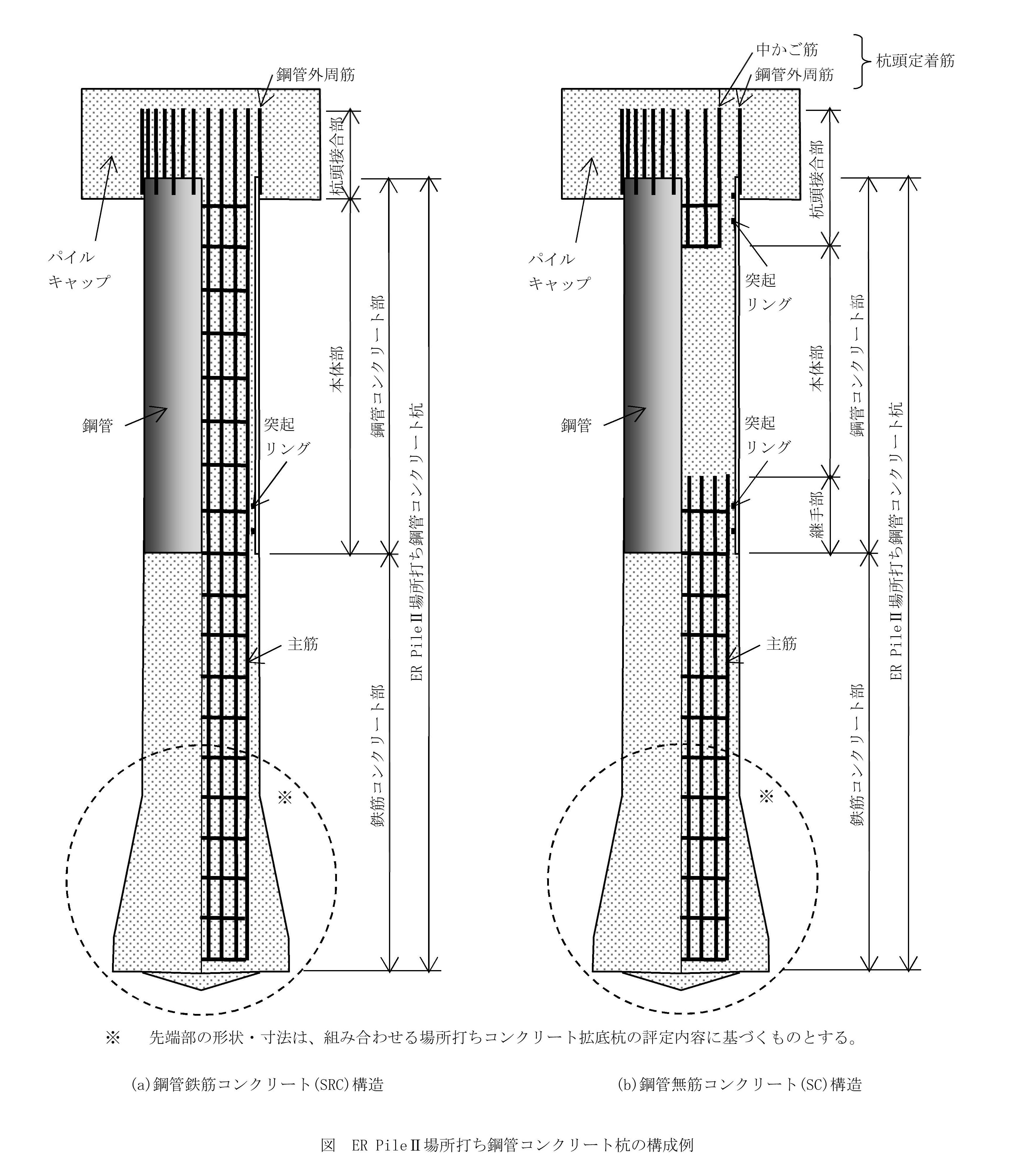 ER PileⅡ(Earthquake Resistant PileⅡ)場所打ち鋼管コンクリート杭は、杭頭部に鋼管を設置した耐震場所打ち杭です。一般的な鋼管を使用し、設計条件を満足するように、突起リング※を必要に応じて鋼管内面に取り付けます。杭頭部を鋼管コンクリート構造にすることで、曲げ耐力・せん断耐力を向上させました。
