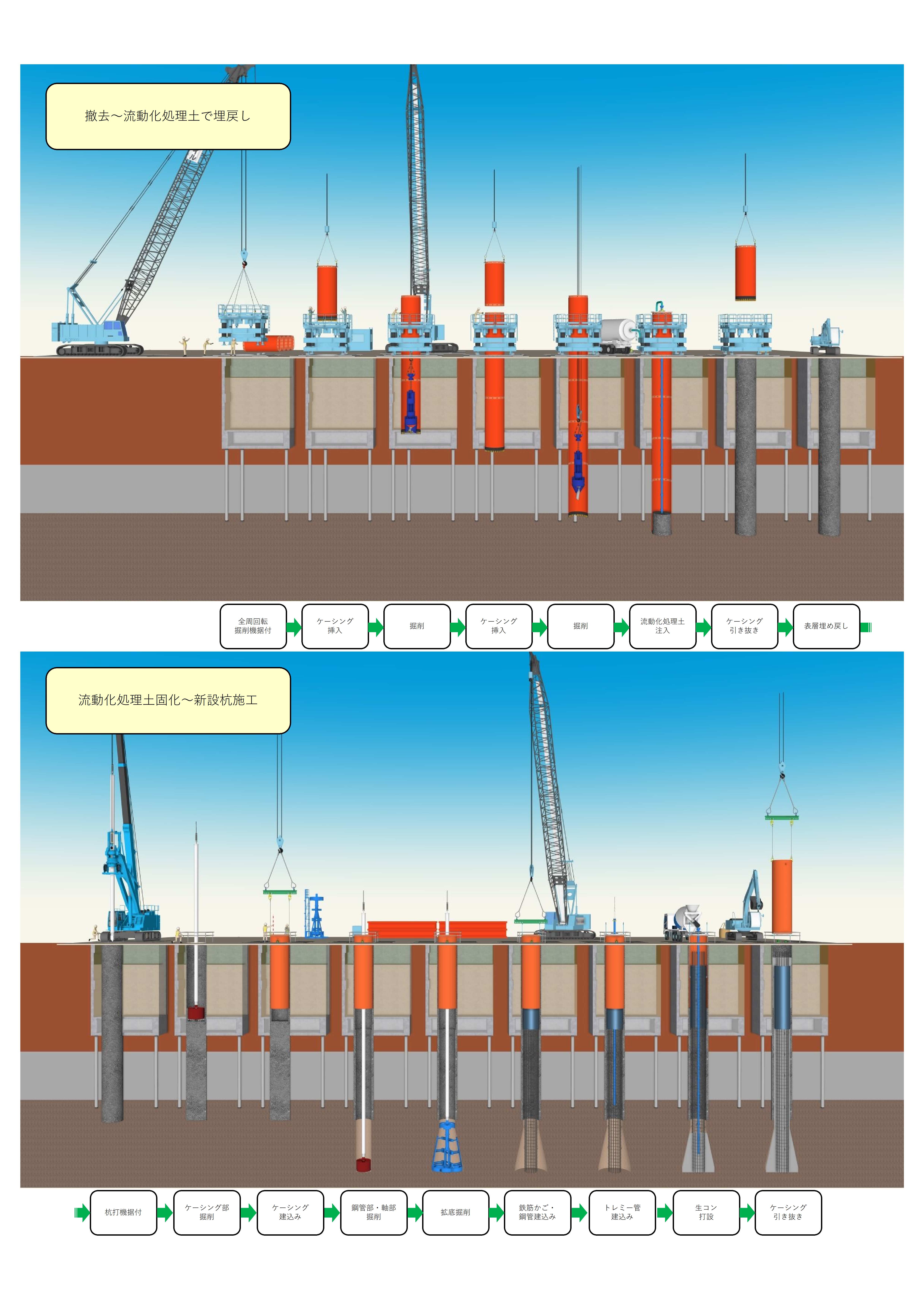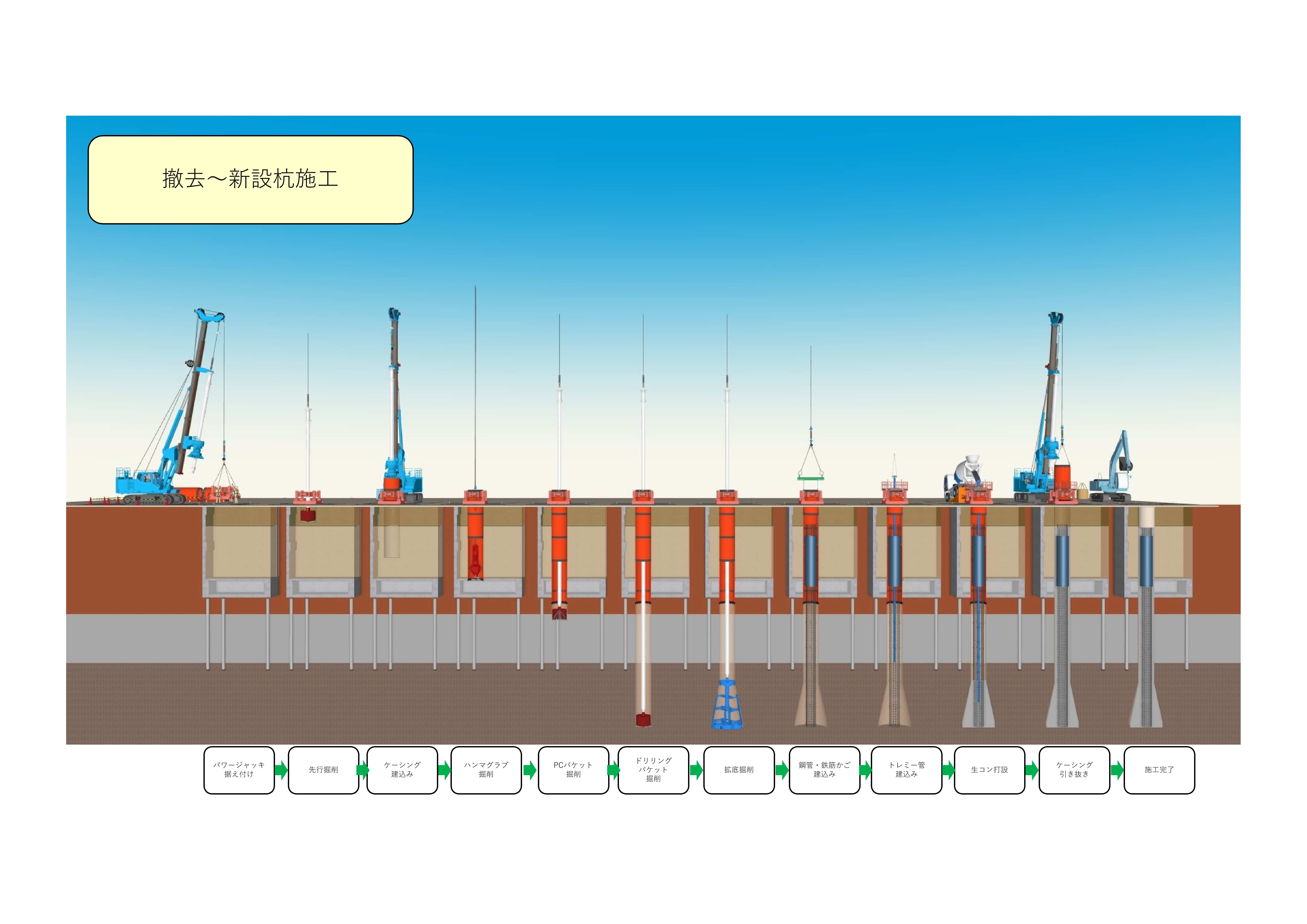全周回転掘削機による撤去 → 新設場所打ち杭